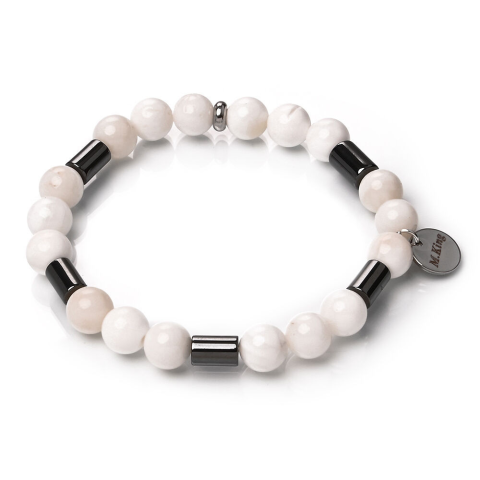 RUGALMAS KARKÖTŐ, a mérete választható.Az ékszer ásványai és tartozékai:– 8 mm-es valódi kagyló gyöngyök– 6x8 mm-es fekete hematit henger gyöngyök– M.King márkajelzésű nemesacél logóbiléta a csatnál– Technika: rugalmas, tart