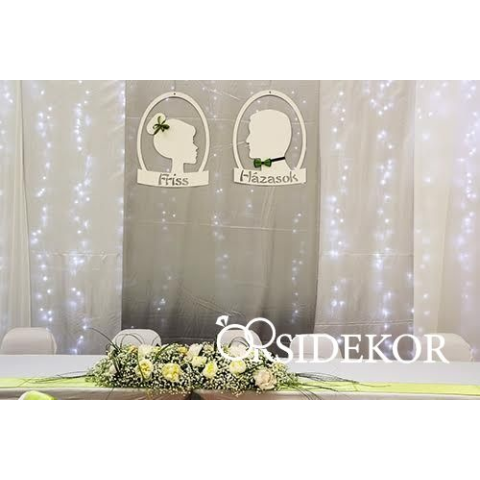 Tedd különlegessé a főasztal mögötti hátfal dekorációt ezzel az egyedi kézműves Friss Házasok feliratú, menyasszony-vőlegény fa táblával. Amennyiben egyedi színben szeretnétek megvásárolni, úgy kérjük, hogy a rendelési folyamat végén található Megjegyzé
