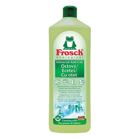 Általános tisztítószer, ecetes, 1000 ml, FROSCH A Frosch ecetes univerzális tisztítószer kitűnően eltávolítja a vízkövet, vízfoltot és szappan maradékokat, valamint megtünteti a kellemetlen szagokat. -használható a fürdőszobában, WC-ben és a konyháb