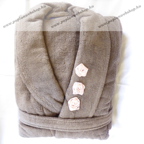 1 kép Frottír sálgalléros női köntös, Szürkésbarna - Virág díszítéssel (100 % pamut), S/M