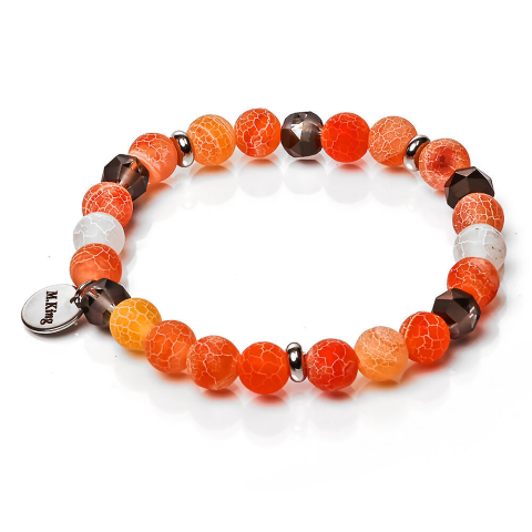 RUGALMAS KARKÖTŐ, a mérete választható. Az ékszer ásványai és tartozékai: – 8 mm-es fagyos narancssárga és fehér tűz achát gyöngyök – 8 mm-es fazettált szürke üveggyöngy – Ezüst színű fémdíszek – M.King márkajelzésű