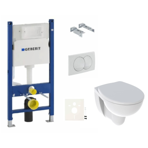 Függő WC szett - a szett a következőket tartalmazza: WC öblítőkör nélkül, Duofix modul könnyű falakhoz / válaszfalhoz, Geberit WC-tartály, Delta vezérlőgomb, WC-ülőke. A WC-ülőke duroplastból készült. A vezérlőgomb műanyagból készült, fehér fényes színben.
