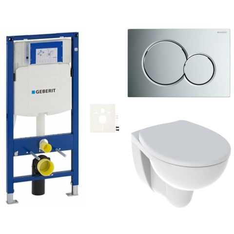 Függő WC szett - a készlet a következőket tartalmazza: WC öblítőkör nélkül, Duofix modul világos falakhoz / válaszfalhoz, Geberit WC-tartály, Delta vezérlőgomb, WC-ülőke. A WC-ülőke duroplastból készült. A vezérlőgomb műanyagból készült és fényes krómozott.