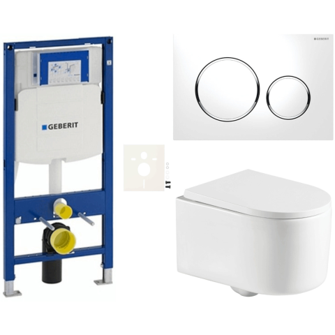 Függő WC-készlet - a készlet a következőket tartalmazza: WC öblítőkör nélkül, Duofix modul világos falakhoz / válaszfalhoz, Geberit WC-tartály, Sigma vezérlőgomb, WC-ülőke. A WC-ülőke duroplastból készült. A vezérlőgomb műanyagból készült és fehér színű.
