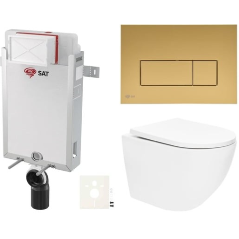 Függő WC-készlet - a készlet a következőket tartalmazza: falra szerelhető vortex öblítőmodul, WC-tartály SAT vezérlőgomb SAT és WC-ülőke. A WC-ülőke duroplastból készült. A vezérlőgomb műanyagból készült, és arany matt színű.