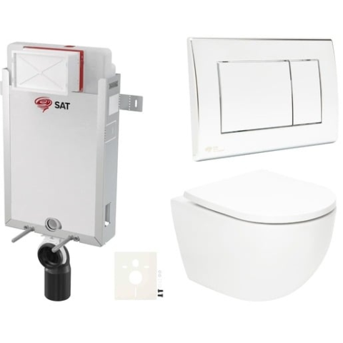 Függő WC-készlet - a készlet a következőket tartalmazza: falra szerelhető vortex öblítőmodul, WC-tartály SAT vezérlőgomb SAT és WC-ülőke. A WC-ülőke duroplast anyagból készült. A vezérlőgomb műanyagból készült és krómfényű.