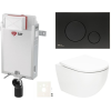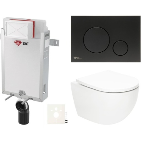 Függő WC-készlet - a készlet a következőket tartalmazza: falra szerelhető vortex öblítőmodul, WC-tartály SAT vezérlőgomb SAT és WC-ülőke. A WC-ülőke duroplastból készült. A vezérlőgomb műanyagból készült és matt fekete színű.