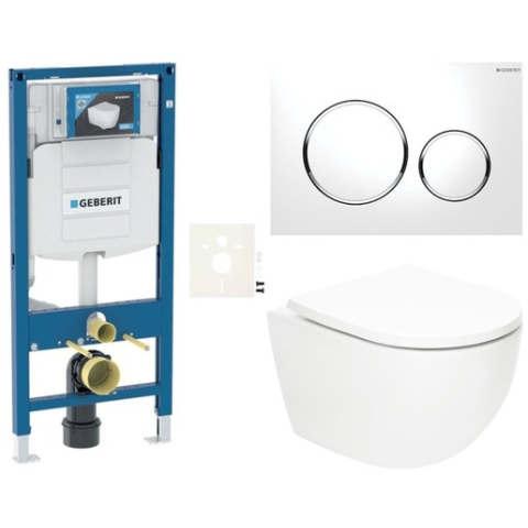 Függő WC szett - a szett a következőket tartalmazza: vortex öblítőmodul Duofix világos falakhoz / előfalhoz, WC tartály Geberit vezérlőgomb Sigmaa WC-ülőke. A WC-ülőke duroplastból készült. A vezérlőgomb műanyagból készült és fehér fényes színű.