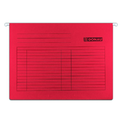 Függőmappa DONAU A/4 karton piros 25 darabos Függőmappák dokumentumok nyilvántartásához és tárolásához. A belsejében lévő tömör fémrúd meghosszabbítja a termék élettartamát. Az előnyomtatott táblázatnak köszönhetően a teljes felülete feliratozható. A