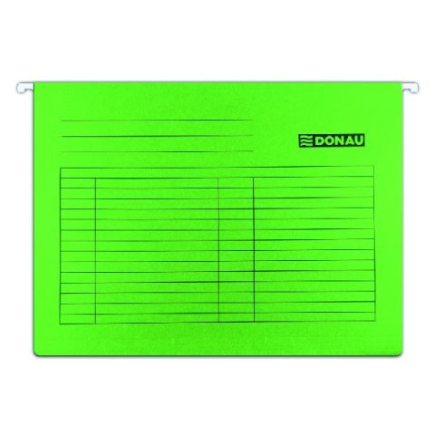 Függőmappa DONAU A/4 karton zöld 25 darabos Függőmappák dokumentumok nyilvántartásához és tárolásához. A belsejében lévő tömör fémrúd meghosszabbítja a termék élettartamát. Az előnyomtatott táblázatnak köszönhetően a teljes felülete feliratozható. A