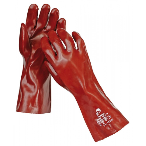Védőkesztyű kötött pamutra mártott PVC-ből. Mechanikai és vegyi ártalmak ellen, 35 cm. Szabványok: EN 388 (3121X) Védőkesztyűk mechanikai kockázatok ellen EN 374-3Védőkesztyűk vegyszerek és mikroorganizmusok ellen. 3. rész: A vegyszerek átbocsátásával sz