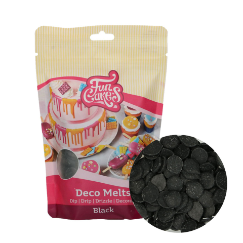 FunCakes Deco Melts fekete színű bevonó, melyet színezve vagy natúr is használhatunk csokinyalókák bevonására, gyümölcsök megmártására vagy éppen a tortákon lecsorgatva azok dekorálására. Felhasználása egyszerű, hiszen megolvaszthatjuk a pasztillákat ha