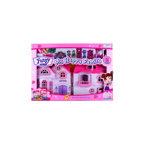 Játszd el egy család életét a Funny babaházban! A rózsaszín Funny műanyag babaház kiegészítőkkel egy elegáns és nagy emeletes házikó, ahol eljátszhatod a játékbabák mindennapjait! A ház fényeket és hangokat is ad ki magából, a csomagban megtalálsz egy fiú és egy lány figurát is, valamint házikedvencüket egy kiskutyust. A Funny műanyag babaház kiegészítőkkel házat be tudod rendezni bútorokkal! A játék 2 darab AA ceruzaelemmel működik, a csomagolás az el