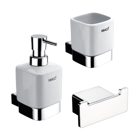 Fürdőszoba-kiegészítő készlet a mosogatóhoz. Falra szerelhető folyékony szappanadagoló, fogkefe tartó és törölközőkampó a Nimco Kibo fürdőszobai kiegészítők sorozatából.