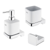 Fürdőszoba-kiegészítő készlet a mosogatóhoz. Falra szerelhető folyékony szappanadagoló, fogkefe tartó és törülközőkampó a Nimco Maya fürdőszobai kiegészítők sorozatából.