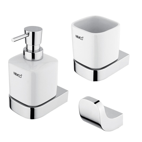 Fürdőszoba-kiegészítő készlet a mosogatóhoz. Falra szerelhető folyékony szappanadagoló, fogkefe tartó és törölközőkampó a Nimco Nikau fürdőszobai kiegészítők sorozatából.