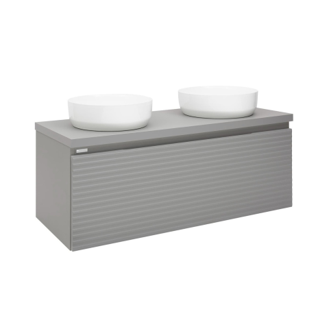 Függesztett fürdőszobai szekrény a mosdó alatt szürke színben, matt felülettel, mérete 118x43x44,8 cm. Laminált felület.