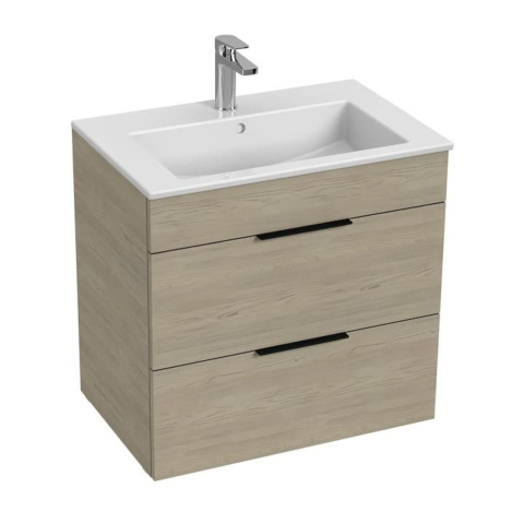 Függesztett fürdőszobai szekrény kerámia mosdóval kőris dekorral, mérete 65x43x62,2 cm. Laminált felület. Egy csavarral.