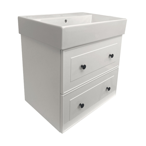 Felakasztható fürdőszobaszekrény kerámia mosdóval fehér színben fényes felülettel mérete 60x53x46 cm. A felület fólia kivitelben.