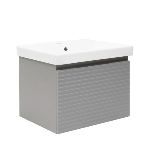 Falra szerelhető fürdőszobai szekrény kerámia mosdóval, szürke színben, matt felülettel, 58x43x44,8 cm méretben. Laminált felület.
