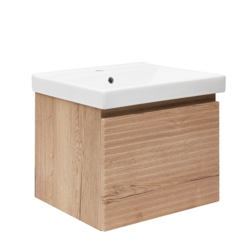 Függesztett fürdőszobai szekrény kerámia mosdóval halifax tölgy dekorral, matt felülettel, 58x43x44,8 cm méretben. Laminált felület.