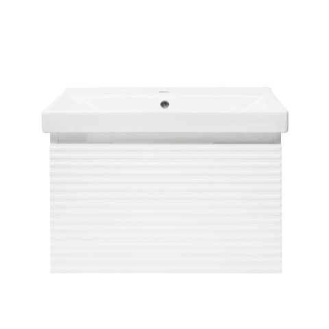 Függesztett fürdőszobai szekrény kerámia mosdóval, fehér fényes színben. 78x43x44,8 cm méretű fényes felülettel. Laminált felület.