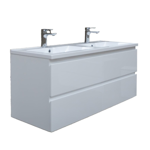 Falra szerelhető fürdőszobai szekrény öntött márvány mosdóval, fehér színben, fényes felülettel. Laminált felület.