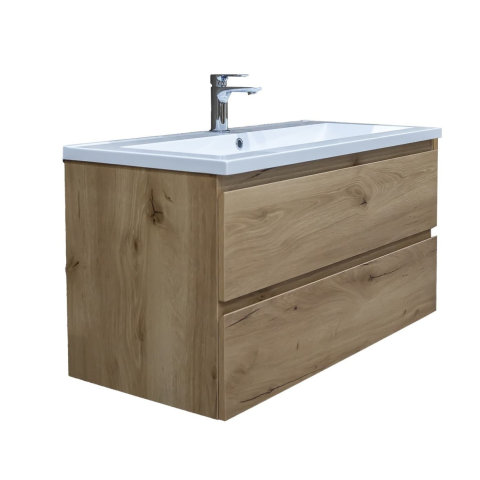Falra szerelhető fürdőszoba szekrény öntött márvány mosdóval, tölgy dekorral, matt felülettel. Laminált felület.