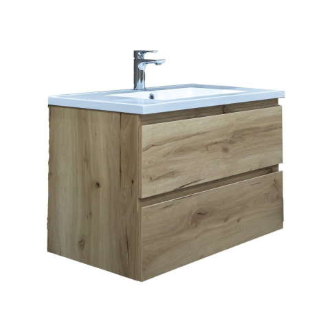 Falra szerelhető fürdőszoba szekrény öntött márvány mosdóval, tölgy dekorral, matt felülettel. Laminált felület.
