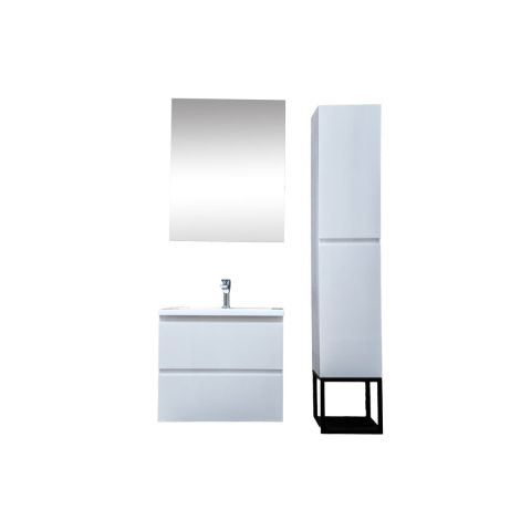 Függesztett fürdőszobagarnitúra öntött márvány mosdóval, fehér fényű dekorációval. Laminált felület.