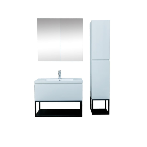 Függesztett fürdőszobagarnitúra öntött márvány mosdóval, fehér fényű dekorációval. Laminált felület.