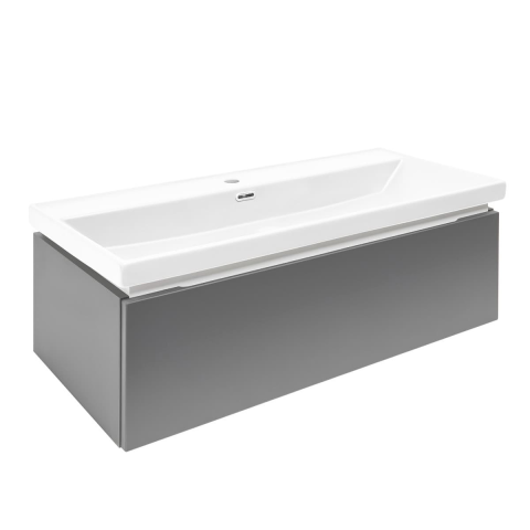 Falra szerelhető fürdőszobai szekrény antracit színű kerámia mosdóval, matt felülettel 100x30x44,8 cm méretű. Laminált felület.