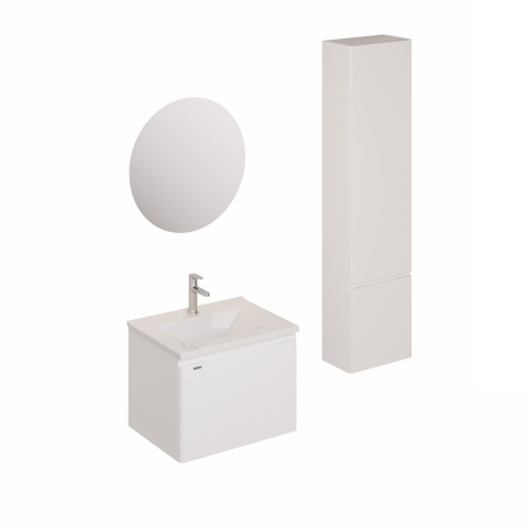 Falra akasztható fürdőszobagarnitúra kerámia mosdóval, fehér színben, fóliázott felülettel. Teljes kiterjesztéssel és eléréssel.