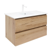 Felfüggesztett fürdőszobaszekrény kerámia mosdókagylóval, tölgyfa dekorban, matt kivitelben, méretek 99x50x45 cm. Felület laminált.