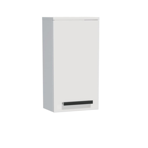 Felakasztható fürdőszobaszekrény alacsony fehér színben fényes felülettel mérete 32,5x63x20 cm. A felület lamino kivitelben. Lassú záródással.