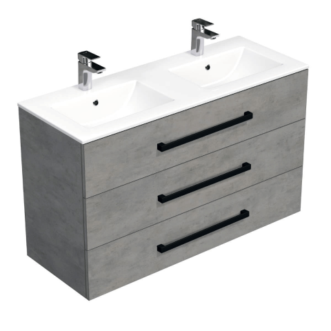 Függő fürdőszobaszekrény fekete fogantyúkkal és kerámia mosdókagylóval, betonutánzatból, matt kivitelben, méretek: 120x71x46 cm. Felület laminált.