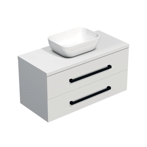 Függő fürdőszobaszekrény fekete fogantyúval és kerámia mosdókagylóval, fehér, fényes kivitelben, méretek 100x71x46 cm. Felület laminált.