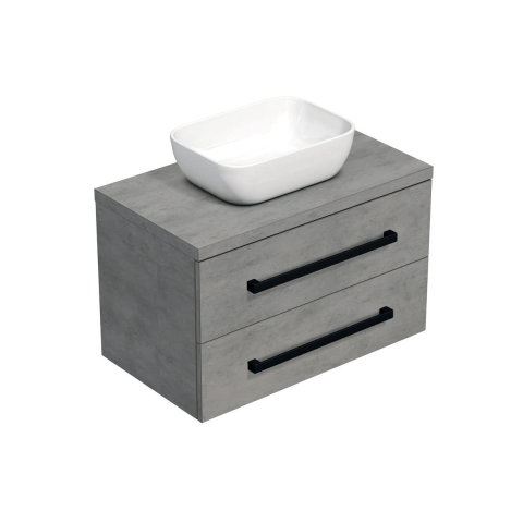 Függő fürdőszobaszekrény fekete fogantyúkkal és kerámia mosdókagylóval, betonutánzatból, matt kivitelben, méret 80x71x46 cm. Felület laminált.