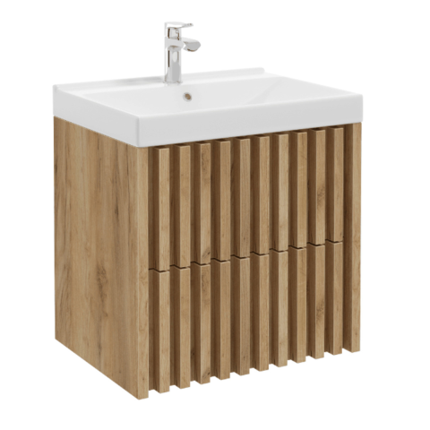 Felakasztható fürdőszobaszekrény kerámia mosdóval tölgyfa dekorban matt felülettel mérete 60x46 cm. A felület fólia kivitelben.