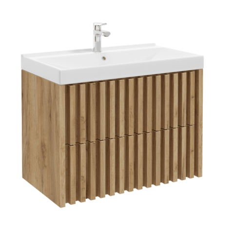 Felakasztható fürdőszobaszekrény kerámia mosdóval tölgyfa dekorban matt felülettel mérete 80x46 cm. A felület lamino kivitelben.