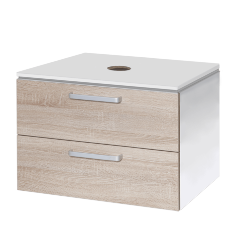 Univerzális szekrény mosdómedence alá. Fehér oldalak, fiókok elülső része és felső lap bardolino tölgy dekorban. A fiókok teljes kinyithatók, lágy záródással. Szétszerelt állapotban szállítjuk. A szekrény 15 kg súlyú mosdókhoz alkalmas.