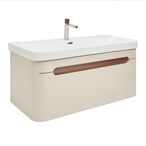 Függő fürdőszobaszekrény kerámia mosdókagylóval, homokbézs színben, matt kivitelben, méret 97,5x43x45 cm. Felület laminált.