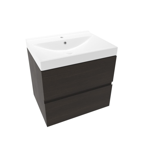 Függő fürdőszobaszekrény kerámia mosdókagylóval, sötét fa dekorban, matt kivitelben, méret 60x50x45,5 cm. Felület laminált.
