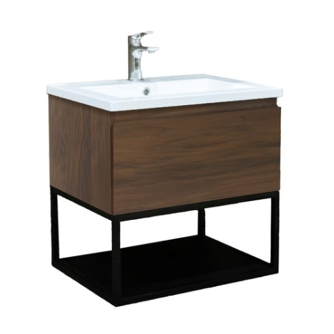 Felakasztható fürdőszobaszekrény mosdóval öntött márványból diófa dekorban matt felülettel mérete 59x30x45 cm. A felület lamino kivitelben.