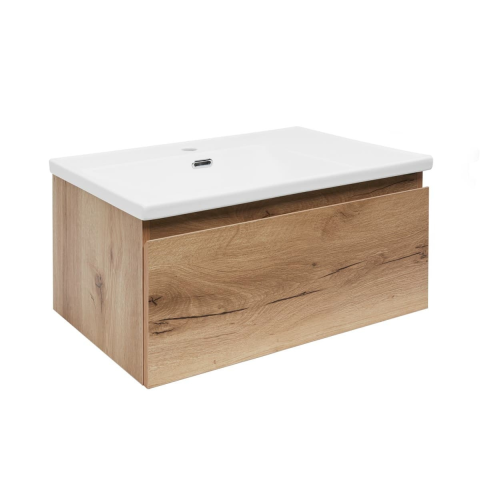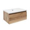 Függő fürdőszobaszekrény kerámia mosdókagylóval, tölgyfa dekorban, matt kivitelben, méret 59x30x45 cm. Felület laminált.