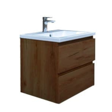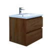 Felakasztható fürdőszobaszekrény mosdóval öntött márványból diófa dekorban matt felülettel mérete 59x50x45 cm. A felület lamino kivitelben.