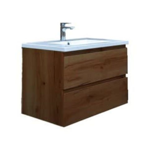 Felakasztható fürdőszobaszekrény mosdóval öntött márványból diófa dekorban matt felülettel mérete 79x50x45 cm. A felület lamino kivitelben.
