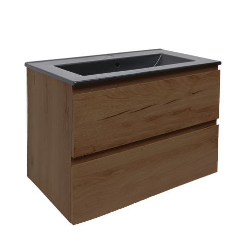 Felakasztható fürdőszobaszekrény kerámia mosdóval diófa dekorban matt felülettel mérete 79x50x45 cm. A felület lamino kivitelben.