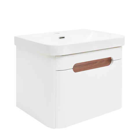 Függő fürdőszobaszekrény kerámia mosdókagylóval, fehér matt kivitelben, matt felülettel, méretek 57,5x43x45 cm. Felület lamino kivitelben.