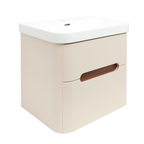Függő fürdőszobaszekrény kerámia mosdókagylóval, homokbézs színben, matt felületkezeléssel, méretek 57,5x53x45 cm. Felület laminált.